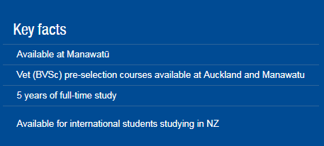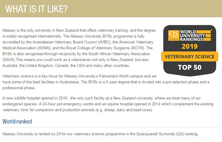 新西兰作为一个畜牧业发达的国家,国民对于动物相当爱护,非常重视它们的健康,对于兽医人才的需求也是日益增长。梅西大学也是目前新西兰唯一一个系统教授兽医科学的大学,QS排名第29位,是学校的强势专业,配有世界上最好的兽医科学基础设施。其兽医学学位已经被美国兽医学会承认,同时也在澳大利亚、加拿大和英国以及全世界绝大多数国家认可及承认。这项荣誉在新西兰国内也是唯一的。
