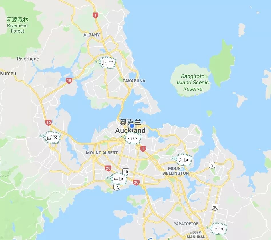 奥克兰的各个区呈包围状环住city。其中中区离city最近,有著名的饭店一条街倒霉路(Dominion Road),好吃的灰常多。东区和西区也属于华人聚集地,好吃的地方也很多。北岸是新崛起的华人中心,在梅西大学上学的同学们一般都住在北岸Albany,当然各类饭店也是琳琅满目。而南区偏远,安全指数不是很高。